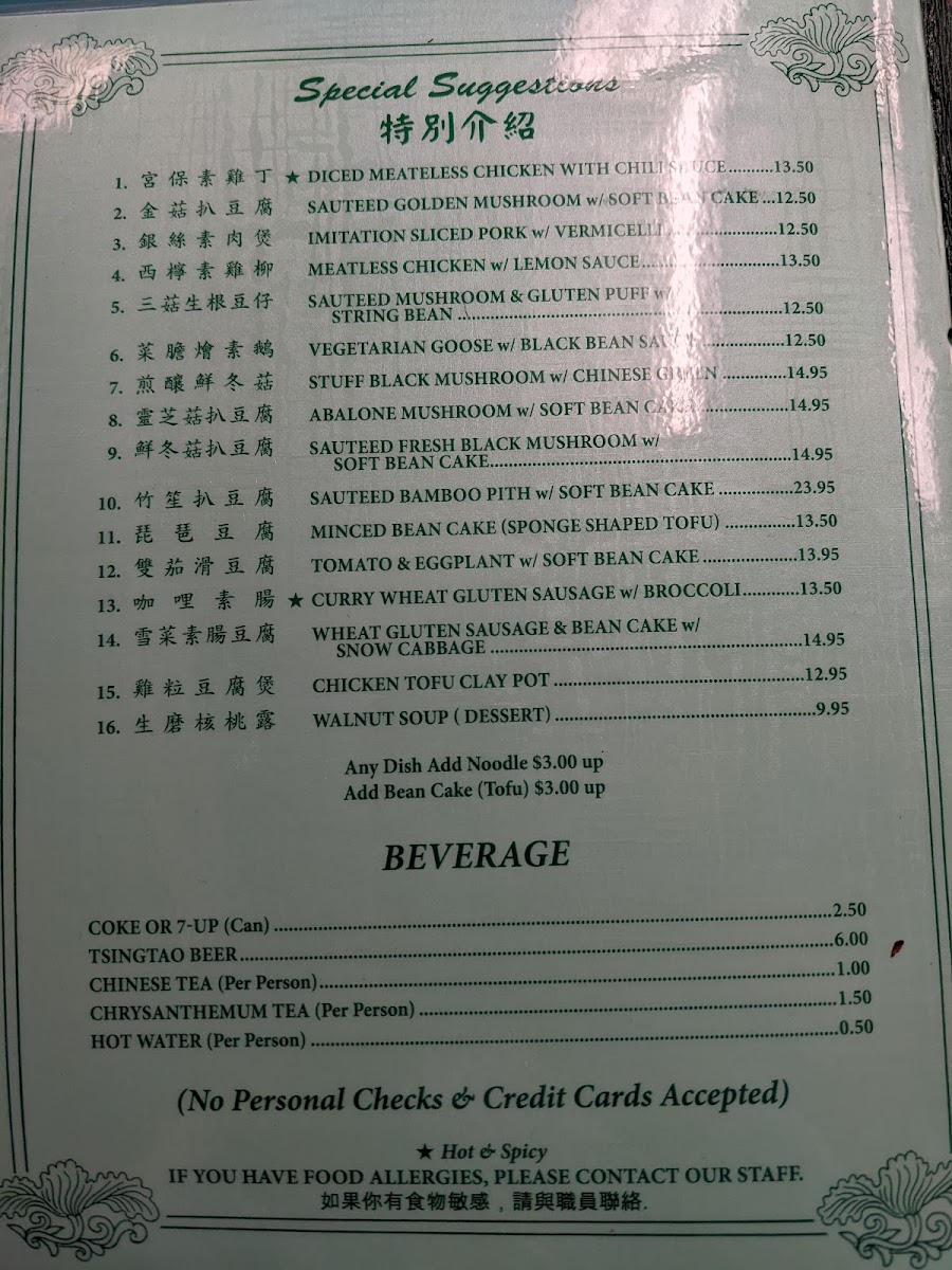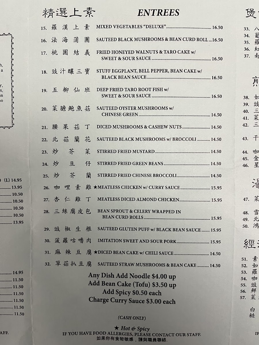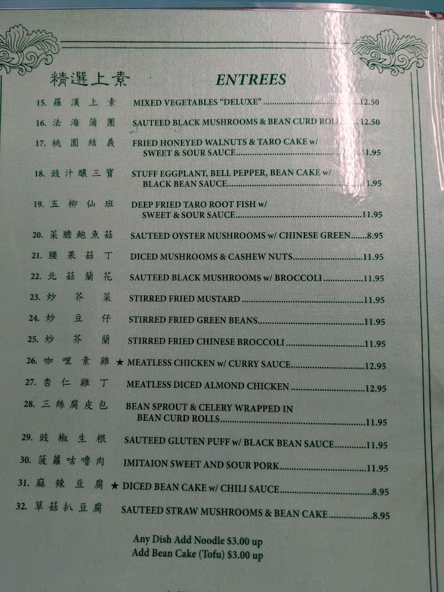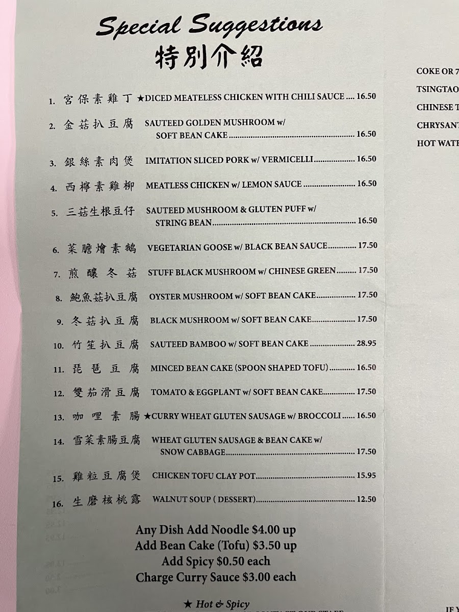 The menu boasts an impressive array of dishes that are rich in flavor and texture, making your dining experience a delightful journey. Start with the Diced Meatless Chicken With Chili Sauce (宫保素鸡丁) at $21.99, a perfect blend of spice and satisfying vegetarian protein. For something lighter, the Sauteed Golden Mushroom With Soft Bean Cake (金菇扒豆腐) also at $21.99 brings an earthy twist, expertly combining the creamy textures of bean cake with fresh sautéed mushrooms.